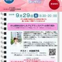 【セカンドサポートズーム交流会報告】 9月29日(月) 医療者でない私たちの繋がり ズーム交流会を開きました(17名参加) ◆テーマ がん経験を活かしたアピアランスケアへの取り組み ~リンパ浮腫の方向けケア用品ブランド「 …