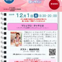 【セカンドサポート~ズーム交流会~12月】 医療者でない私たちの繋がりの場「ズーム交流会」 話を聞き繋がりたいトップランナーをゲストに。 質問OK!その道のプロに聞いてみましょう。 12月テーマは マシュマロ・タッチとは …